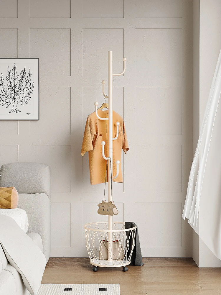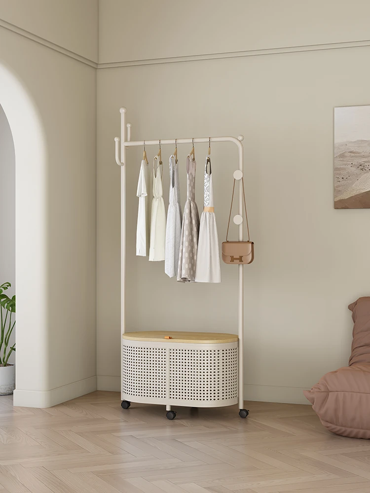 和風モダン!移動式ラタン風ハンガーラック - 寝室やリビングにぴったりのオシャレなランドリーバスケット収納!トレンドのクリーム色デザインで、コートや帽子もスッキリ収納。あなたのお部屋を素敵に演出します!