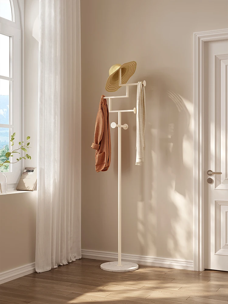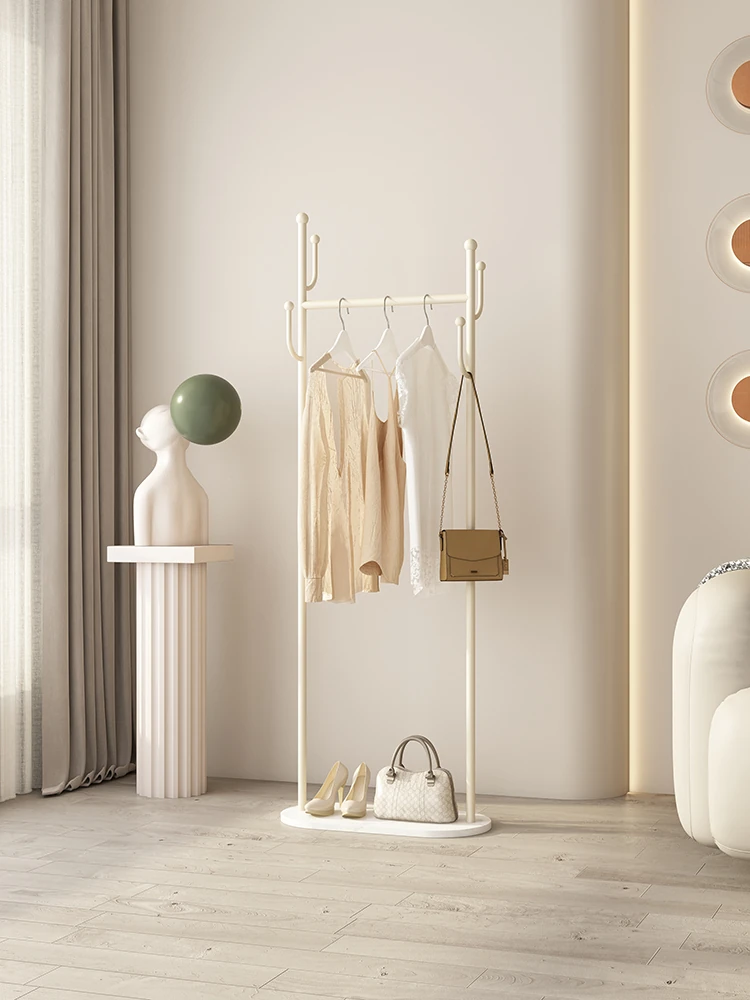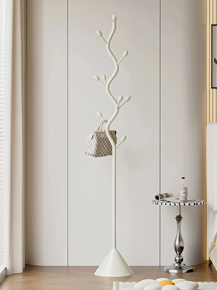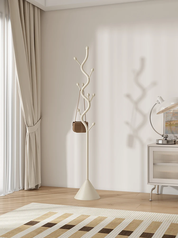 クリームカラーのコートハンガー - 寝室にぴったりなスタイリッシュなフロアスタンド衣類ラック!洗練されたデザインで、服や小物を美しく収納。オシャレで機能的なアートコートラックで、あなたの空間を華やかに演出!