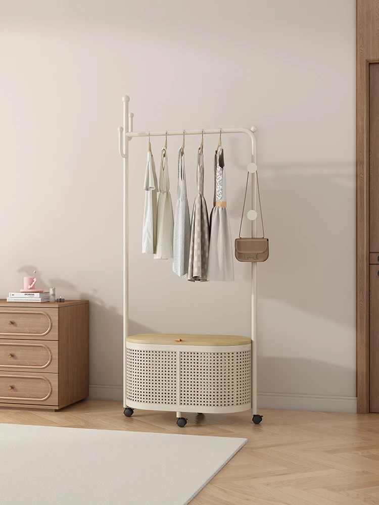 和風ラタン調のスタンドハンガー - シンプルでラグジュアリーな衣類収納、リビングや寝室にも最適!バスケット付きで便利、移動も簡単なクリーム色のコートラック。おしゃれで機能的なインテリアの必需品!