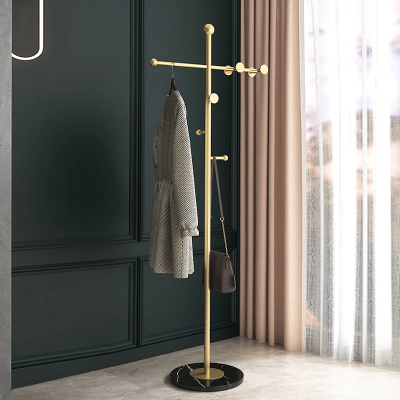 マーブルデザインのスタイリッシュなコートハンガー - モダンでシンプルな北欧風、豪華なブラスカラーが魅力の衣類ラック。あなたの寝室を洗練された空間に演出します!