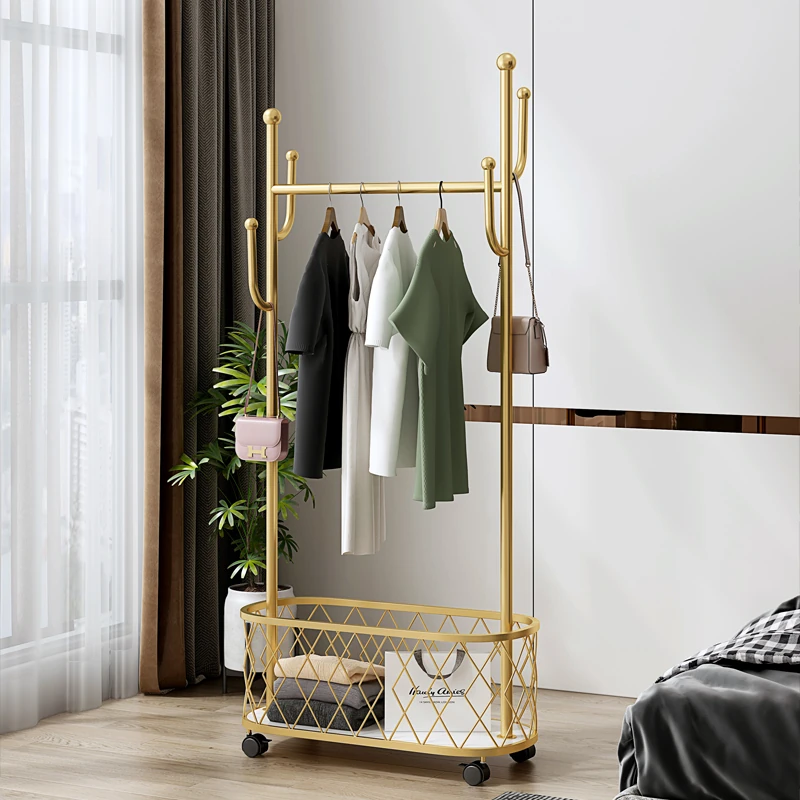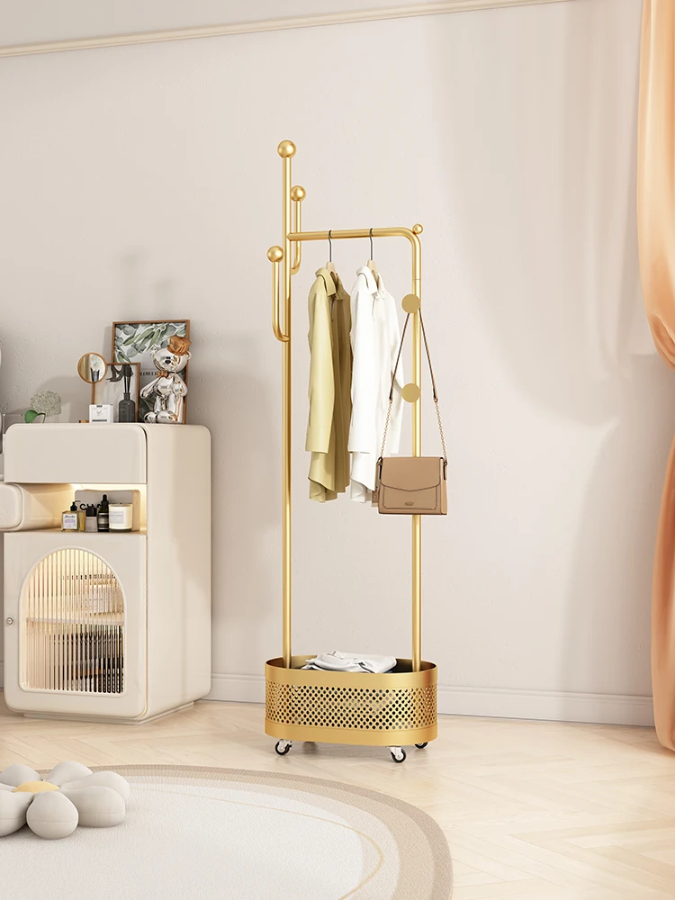 クリーム風のスタイリッシュな衣類ハンガー、ベッドサイドに最適!夜のお洋服置き場として便利で、移動も簡単。汚れた衣類を収納できるバスケット付きの多機能コートラック!