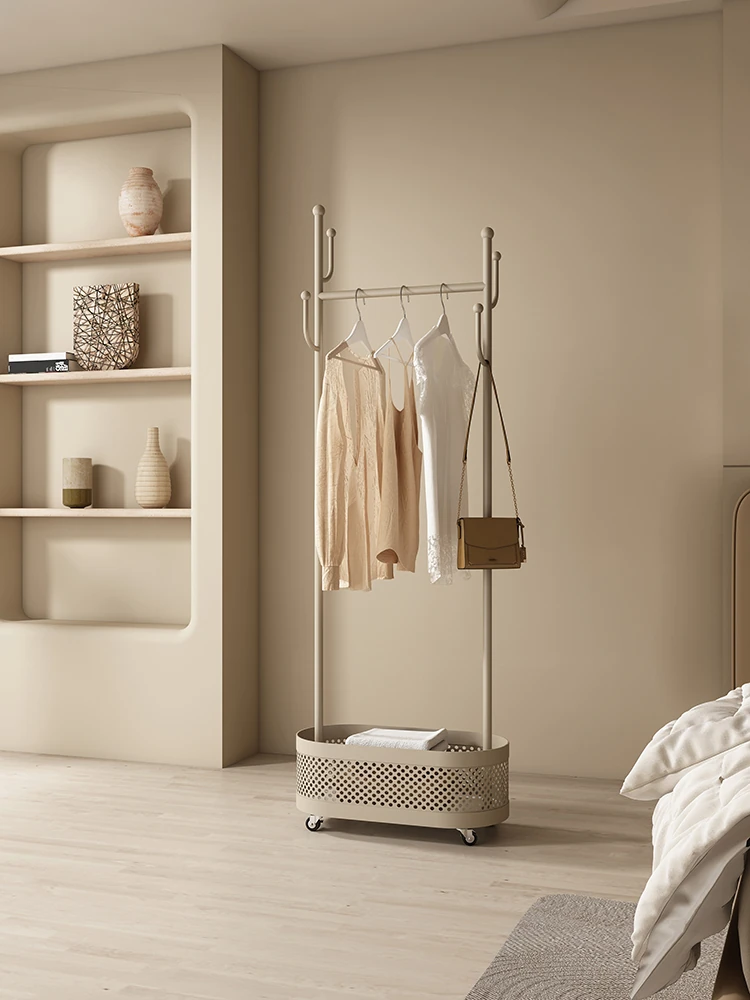 移動式の衣類収納バスケット付きハンガー - シンプルでおしゃれなクリーム風デザイン、寝室にぴったりのスタイリッシュな衣帽掛け!整理整頓も楽々、インテリアにも馴染むアイテムです。