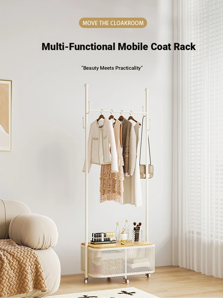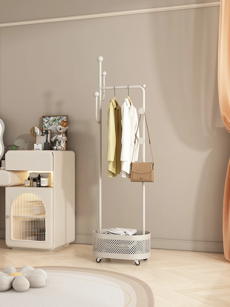 Mobile Rolling Coat Rack with Wheels – Stylish Cream Iron Clothes Hanger and Laundry Basket for Bedroom, Perfect for Organizing Your Space!