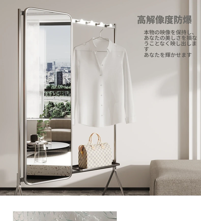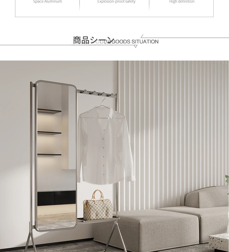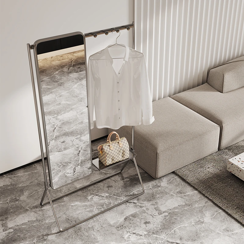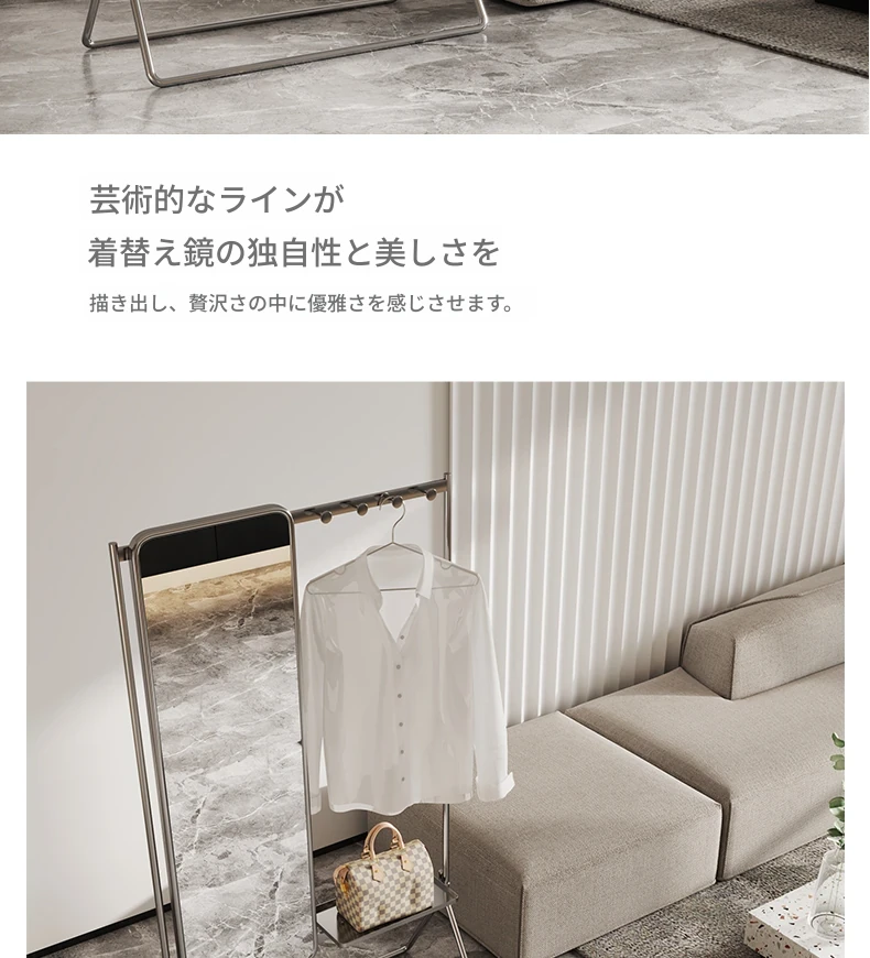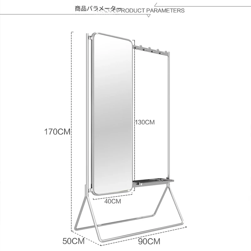 北欧スタイルのクロムコート衣類ハンガー一体型全身鏡モダン寝室用フロアスタンドハンガー|スタイリッシュなデザインで、機能性と美しさを兼ね備えたアイテム!おしゃれな空間を演出します。
